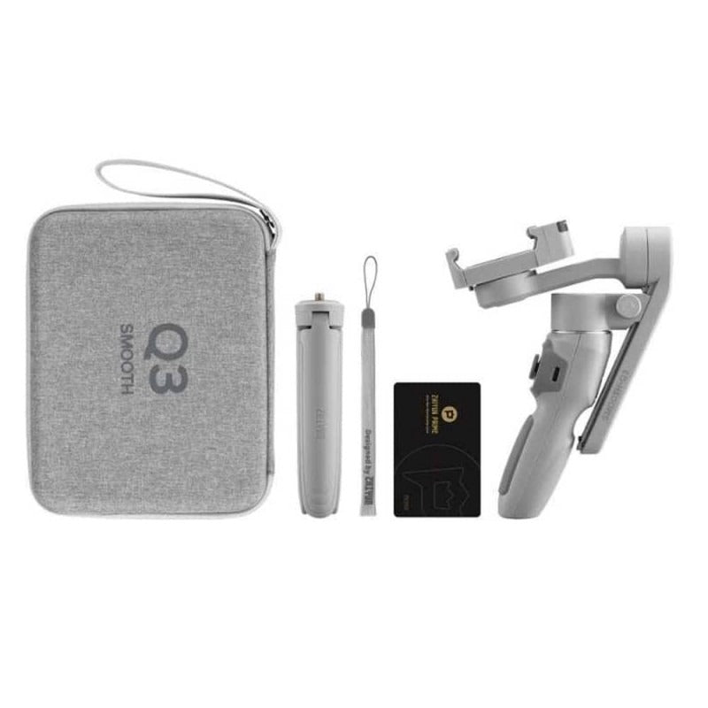The Zhiyun Smooth-Q3 is a compact folding 3-axis stabilizer for smartphones, designed with a built-in LED video light with three selectable brightness levels. It provides stabilized motion along the pan, tilt, and roll axes to let you capture smooth, professional-looking video with your phone. The Smooth-Q3 easily switches between portrait and landscape modes at the press of a button, allowing you to shoot both cinematic and social media videos while the LED light illuminates your subjects. The phone holder supports smartphones up to 3.5″ wide, covering most phones. Compact Folding 3-Axis StabilizerBuilt-In Rotatable LED Video LightLandscape and Portrait ModesLive Streaming via Companion Mobile AppAdvanced Smart TrackingSimplified Dolly Zoom ModeSmartFollow 3.0Gesture ControlSMART Editing<Ergonomic Design with Nonslip Handle